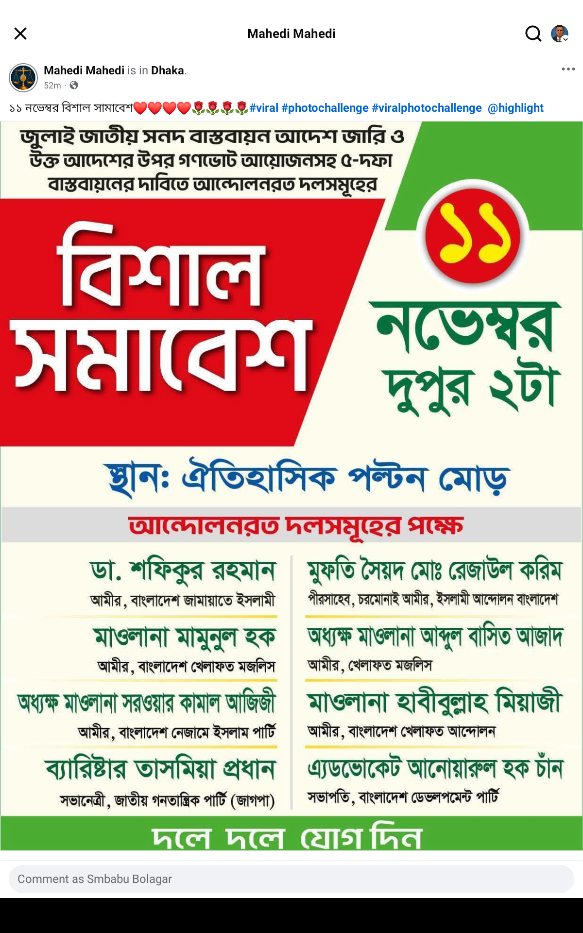 সমাবেশ জামায়াতে ইসলামীর আমির ডাক্তার শফিকুর আন্দোলন, বাংলাদেশ খেলাফত মজলিসের আমির মাওলানা মামুনুল হক, খেলাফত মজলিসের আমির অধ্যক্ষ মাওলানা আব্দুল বাসিত আজাদ, নেজামে ইসলাম পার্টির আমির অধ্যক্ষ মাওলানা সরওয়ার কামাল আজিজি, বাংলাদেশ খেলাফত আন্দোলনের আমির মাওলানা হাবিবুল্লাহ মিয়াজী, বাংলাদেশ ডেভেলপমেন্ট পার্টির সভাপতি এডভোকেট আনোয়ারুল হক চাঁন এবং জাতীয় গণতান্ত্রিক পার্টির রাশেদ প্রধানসহ আটদলের শীর্ষ নেতৃবৃন্দ বক্তব্য রাখবেন বলে। জানা গেছে। দলে দলে যোগ দিন ১১ নভেম্বরের সমাবেশ সফল করুন।