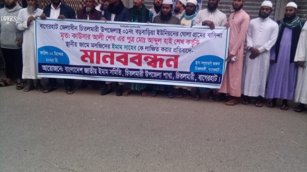 চিতলমারীতে ইমামকে হুমকি দেওয়ার ঘটনায় মুসল্লিদের মানববন্ধন